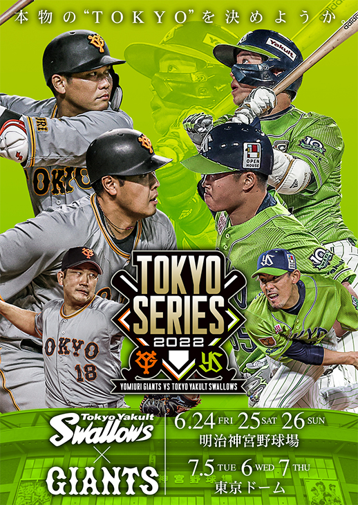 共同企画 TOKYOシリーズ 2022年6月24日、25日、26日 東京ヤクルト対読売ジャイアンツ(明治神宮野球場)と、7月5日、6日、7日 巨人対ヤクルト(東京ドーム)のビジュアルを1枚。