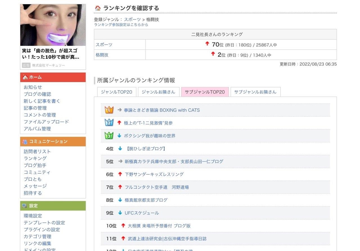 格闘技部門でアクセスランキング2位(1340人中)、スポーツ部門では25867人中70位。