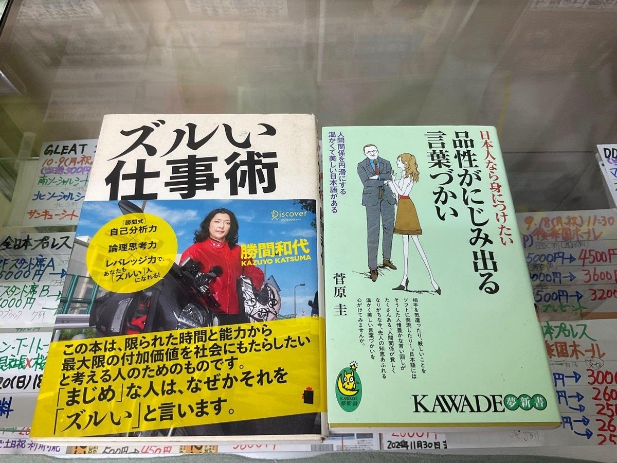 全て売り切れたが、木更津キャッツアイ日本シリーズ、ヒーローインタビュー、ワールドシリーズ、不夜城パンフ、ズルい仕事術/勝間和代、日本人なら身につけたい品性がにじみ出る言葉づかい/菅原圭を紹介。