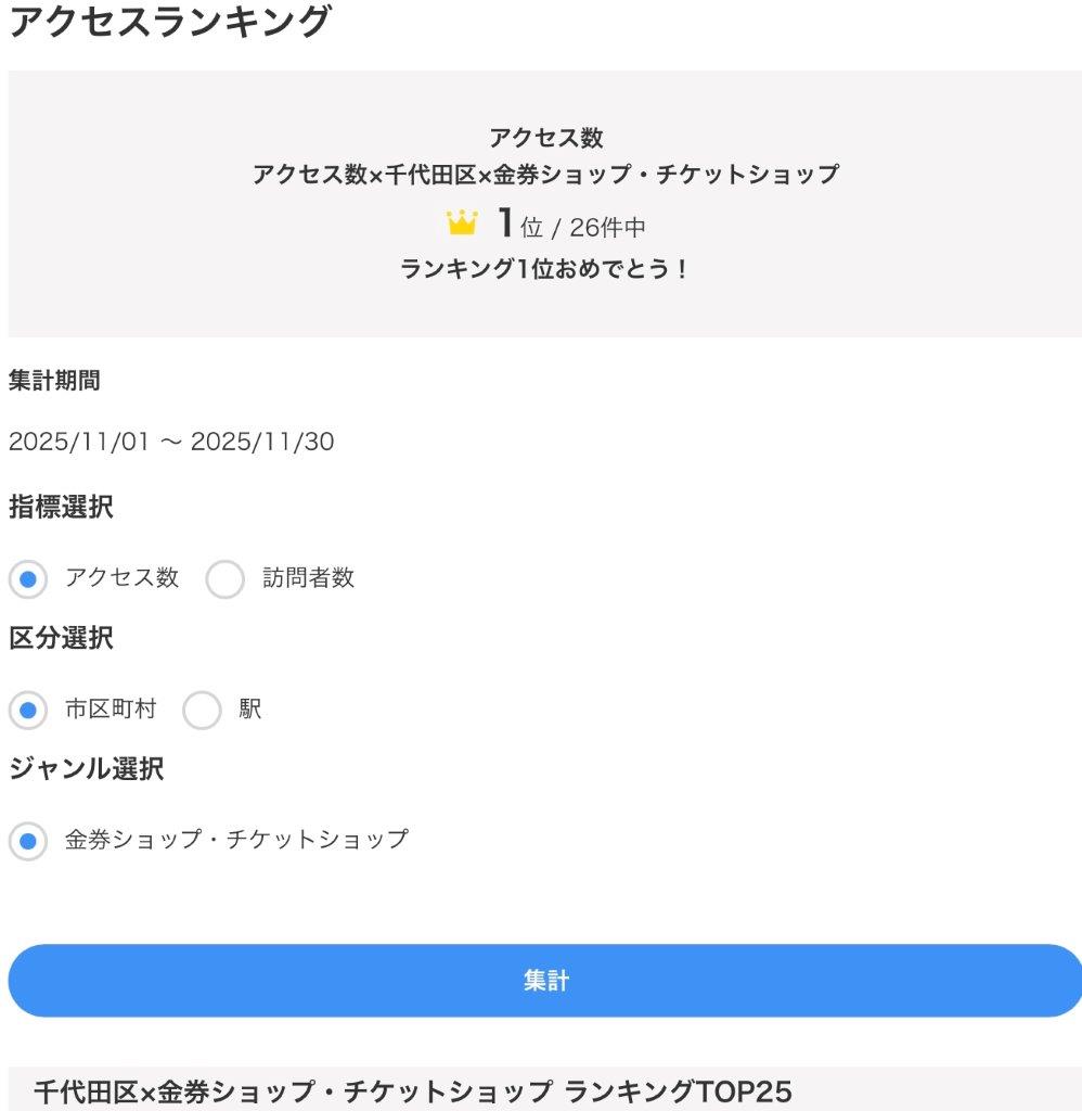 国内最大級のオンライン商店街・エキテンが管理する千代田区×金券ショップ・チケットショップ部門の2025年11月アクセス数ランキングで、チケット&トラベルT-1は3ヶ月ぶり13回目の1位を獲得した。